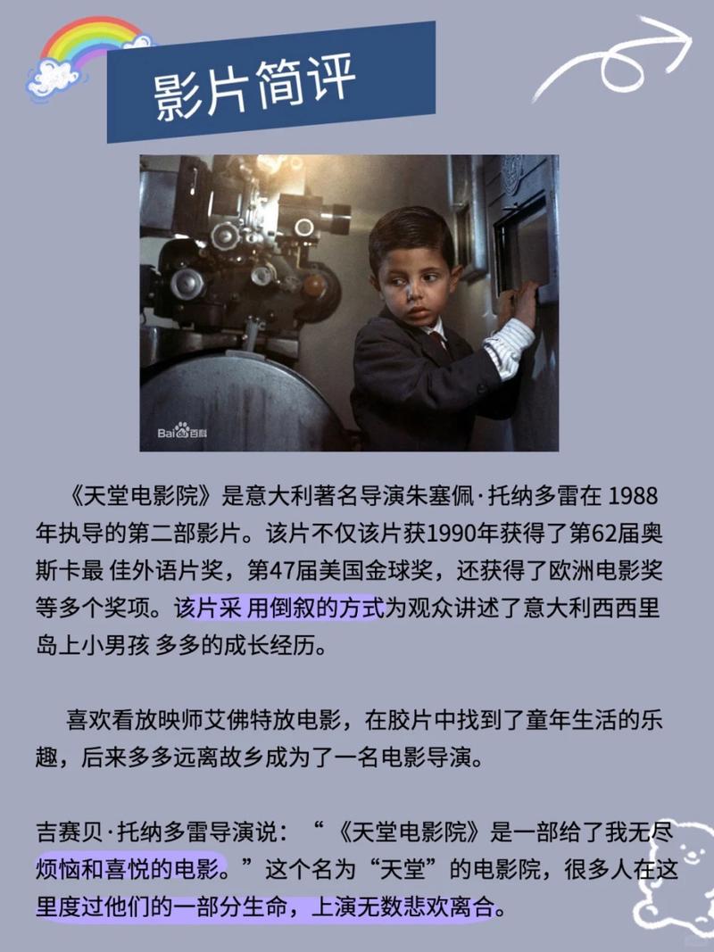 《天堂电影院》是意大利导演朱塞佩·托纳多雷1988年执导的经典电影,讲述二战前后西西里小镇男孩托托与电影放映师阿尔弗雷多的忘年之交。通过小镇唯一影院“天堂电影院”的兴衰,影片以怀旧笔触展现电影如何成为战乱年代的精神慰藉,以及托托从痴迷胶片到成为导演的成长历程。阿尔弗雷多“不要回头”的忠告推动托托走向更广阔人生,而年迈回乡时废弃影院爆破的蒙太奇,将童年记忆与电影魔力凝结成永恒。该片获戛纳评审团大奖和奥斯卡最佳外语片,以温暖质朴的叙事探讨艺术、故乡与人生的羁绊。